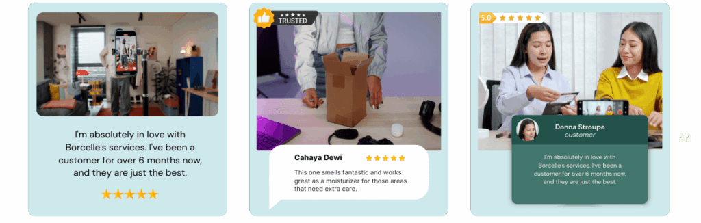 โดดเด่นด้วยรูปภาพรับรองกว่า 1,000 ภาพ วิดเจ็ตเว็บไซต์ และ Review Wall, Testimonial Wall ที่หาไม่ได้จากที่อื่น สร้างและแบ่งปันในไม่กี่วินาทีใน แพลตฟอร์มเรา